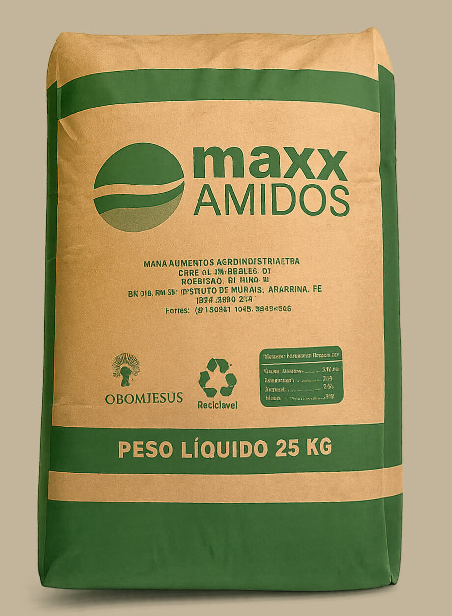 Fécula in natura de alta pureza para aplicações industriais diversas, produzida com tecnologia sustentável e controle rigoroso de qualidade.