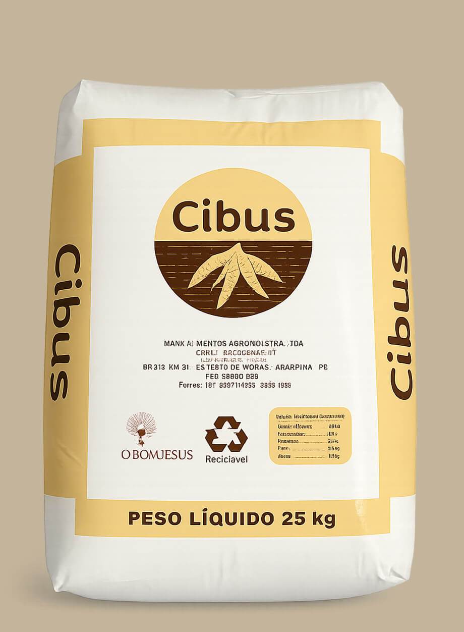 Ração nutritiva desenvolvida a partir de subprodutos da mandioca, oferecendo excelente valor nutricional para alimentação animal.